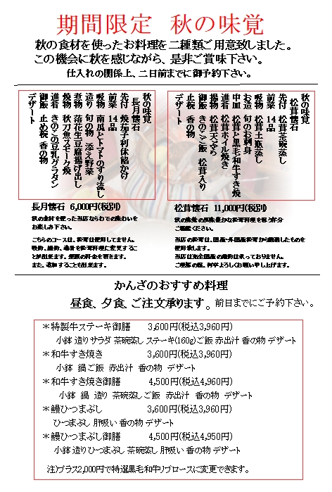 かんざでは、季節の和食(懐石料理、一品料理)の数々をご用意いたします。